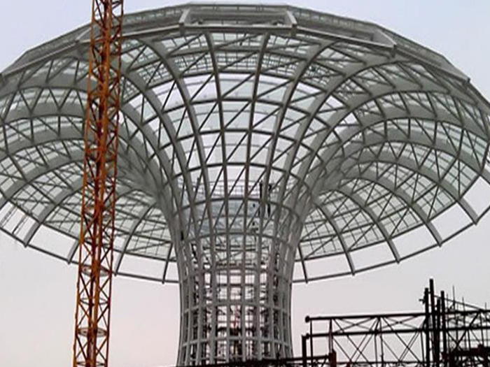 二、球形网架结构因其结构新颖,受力合理,自重轻、用钢量低等优点。如大型体育场馆球形信阳螺栓球网架、公共场馆球形网架、电厂信阳螺栓球网架、水泥工业球形网架、仓储物流球形网架、信阳干煤棚工业球形网架、信阳收费站信阳加油站球形网架、展览中心、影剧院、商场、航站楼、候车厅、工厂信阳车间、仓库、电视塔等球形螺栓球节点网架。国内球形网架结构主要分为:信阳焊接球节点网架及螺栓球节点网架两种。螺栓球节点网架其构件工厂内加工量较大,现场安装便捷,适用于现场工期紧,信阳施工条件、用电量受制约,网架形状复杂、信阳杆件定位困难的异形结构。螺栓球节点球形网架系统基本由信阳杆件、螺栓球、支撑支座等组成。按照节点形式可分为交叉信阳桁架体系、四角锥体系、三角锥体系等。支撑方式多为固定支座支撑。对于大面积、大跨度及有特殊受力或伸缩要求的网架结构可采用橡胶支座、滑移支座、球铰支座等支撑形式,以满足结构自身的受力稳定、均衡,便于内力释放等设计要求。